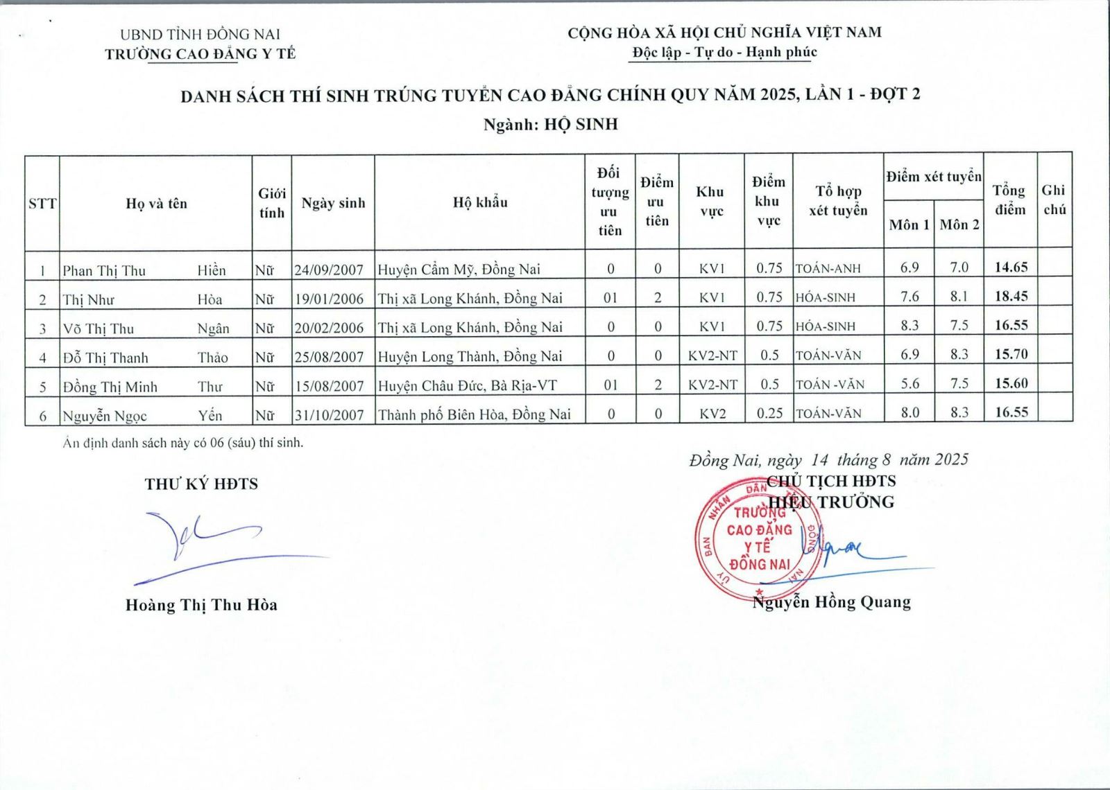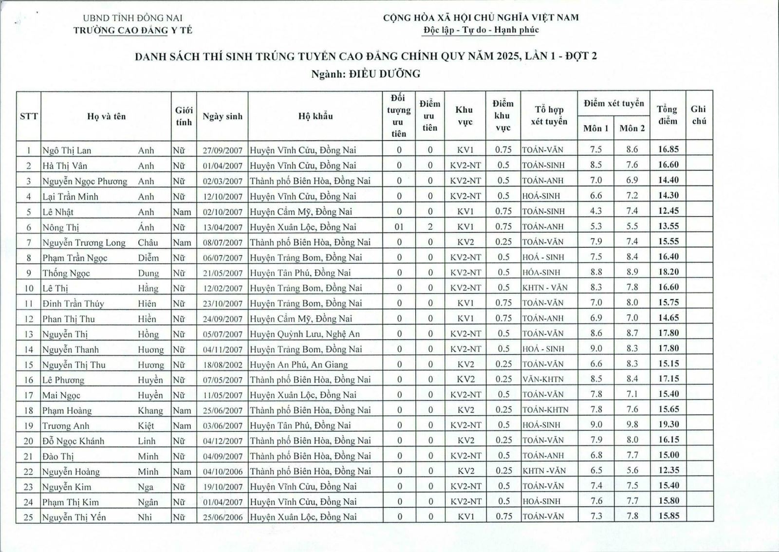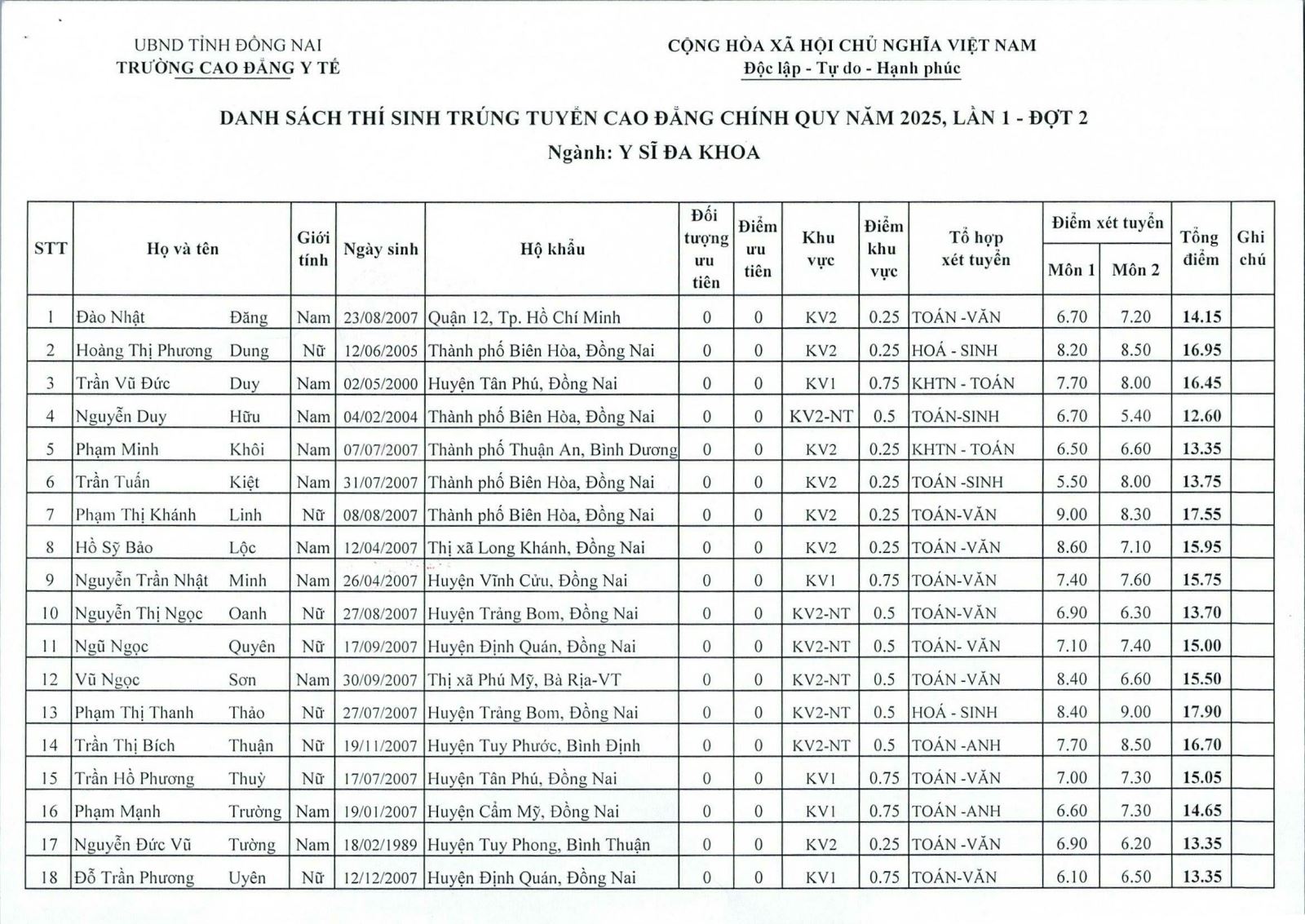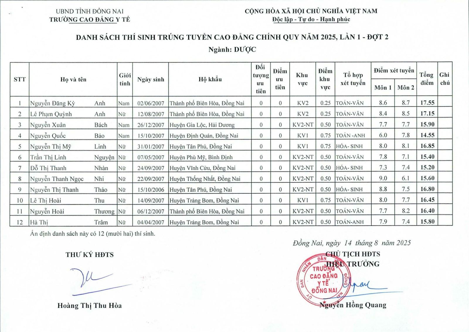 Sau đây là danh sách thí sinh trúng tuyển Cao đẳng chính quy năm 2025, lần 1 đợt 2 các ngành: