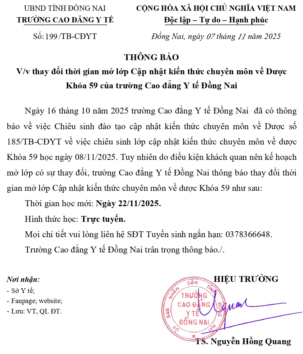 Thông báo về việc thay đổi thời gian mở lớp cập nhật kiến thức chuyên môn về Dược khóa 59