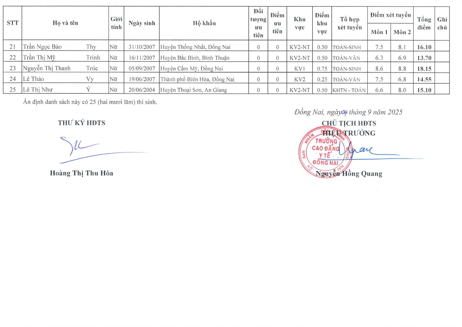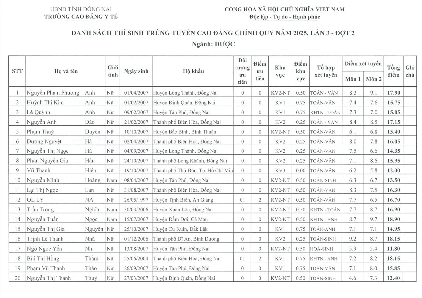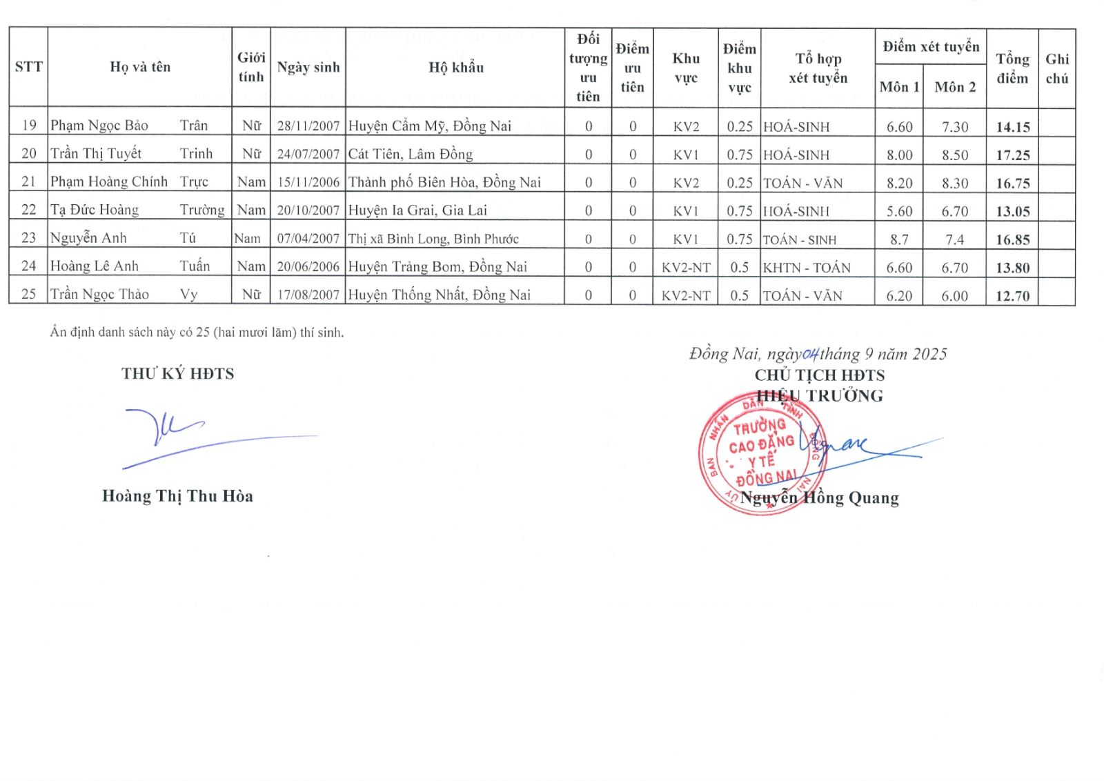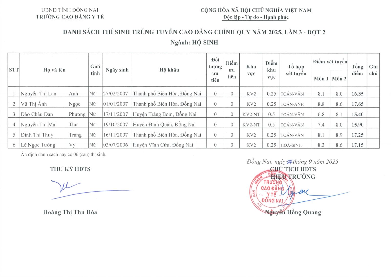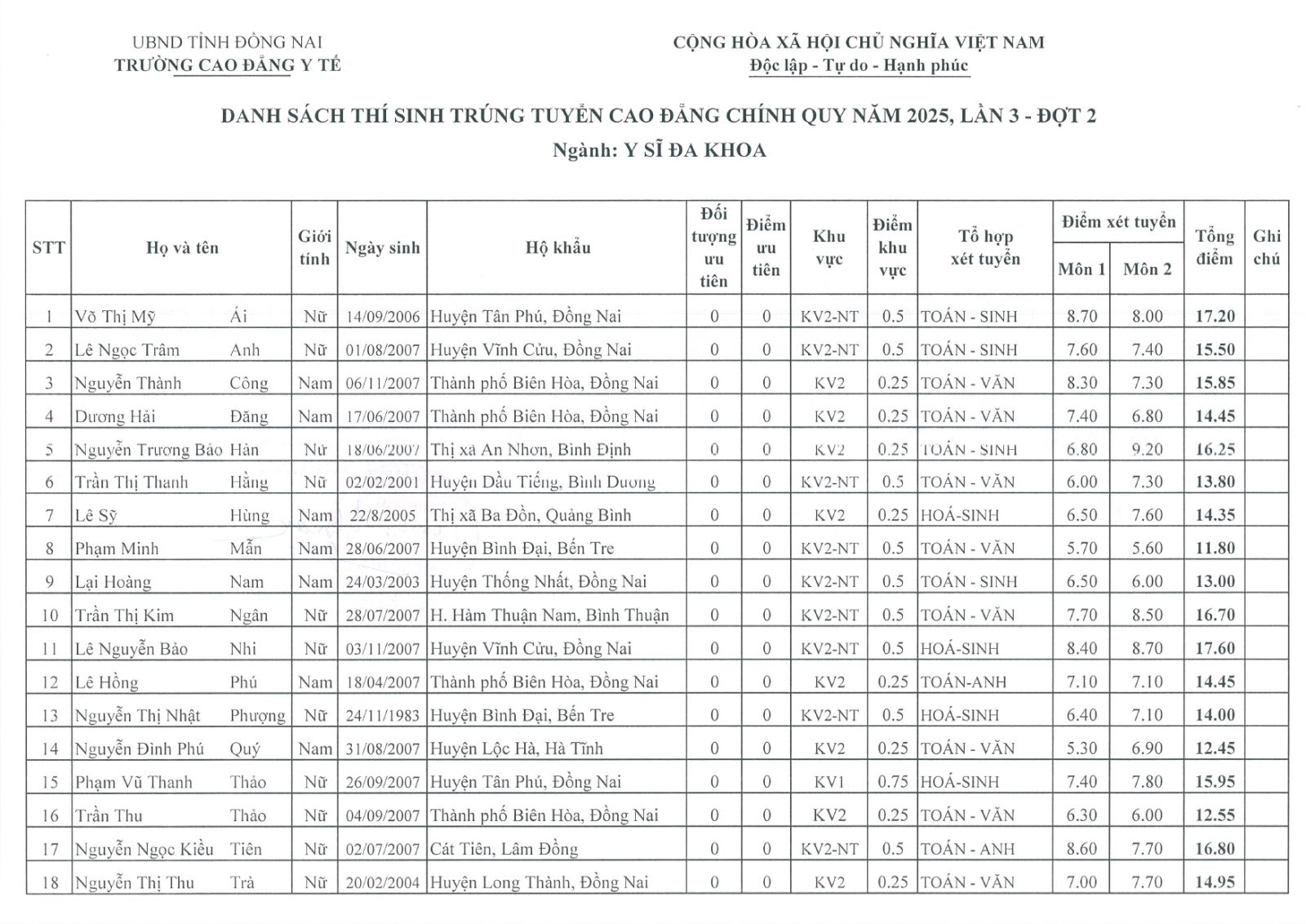 Sau đây là danh sách thí sinh trúng tuyển Cao đẳng chính quy năm 2025, lần 1 đợt 2 các ngành: