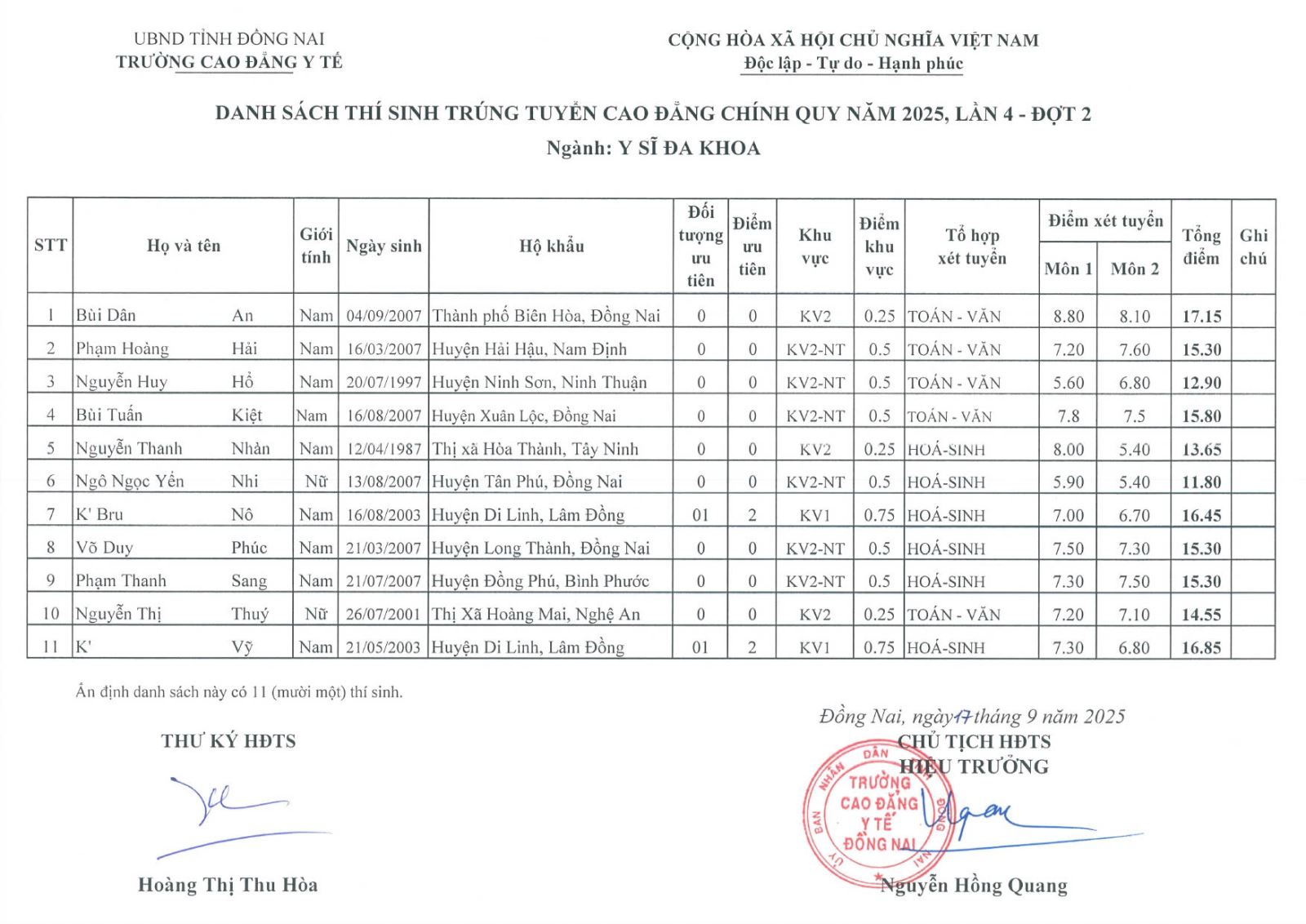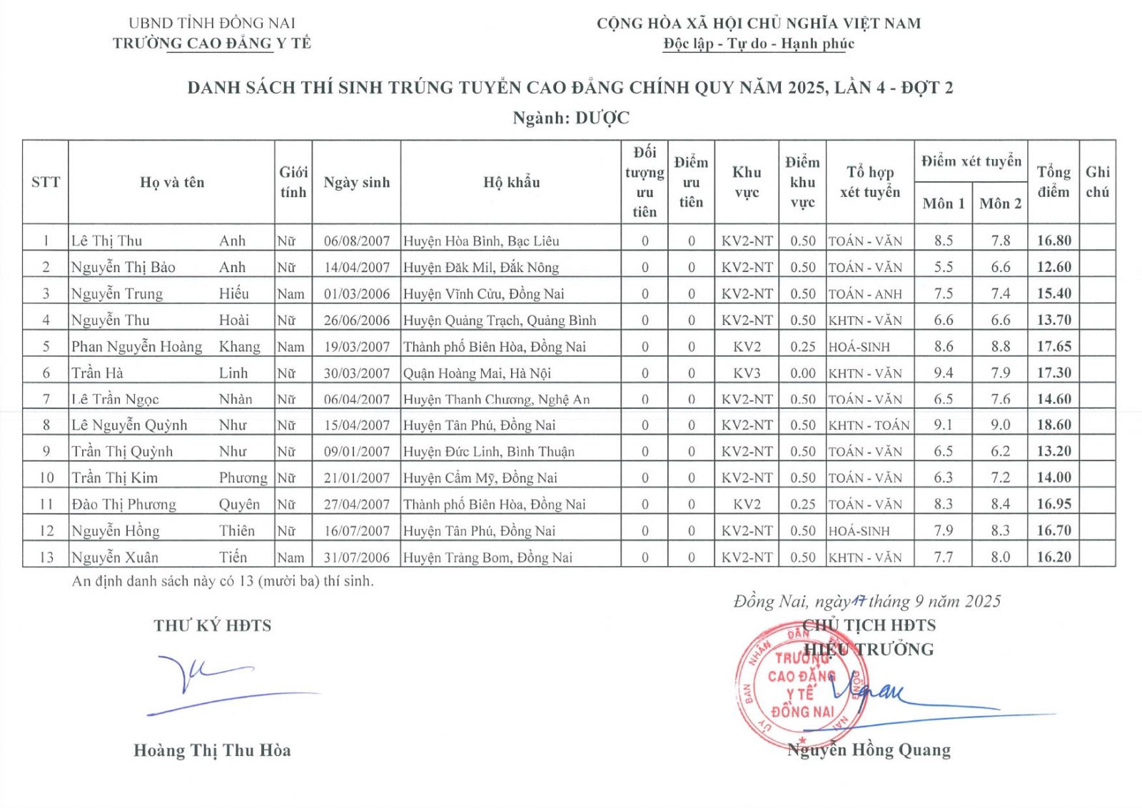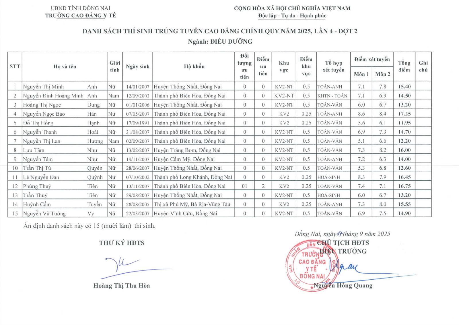 Sau đây là danh sách thí sinh trúng tuyển Cao đẳng chính quy năm 2025, lần 4 đợt 2 các ngành: