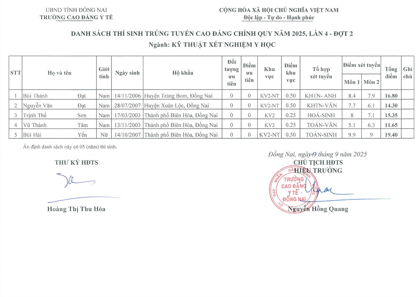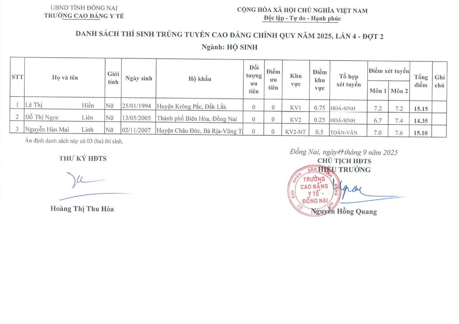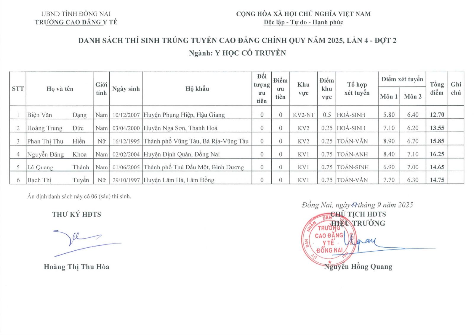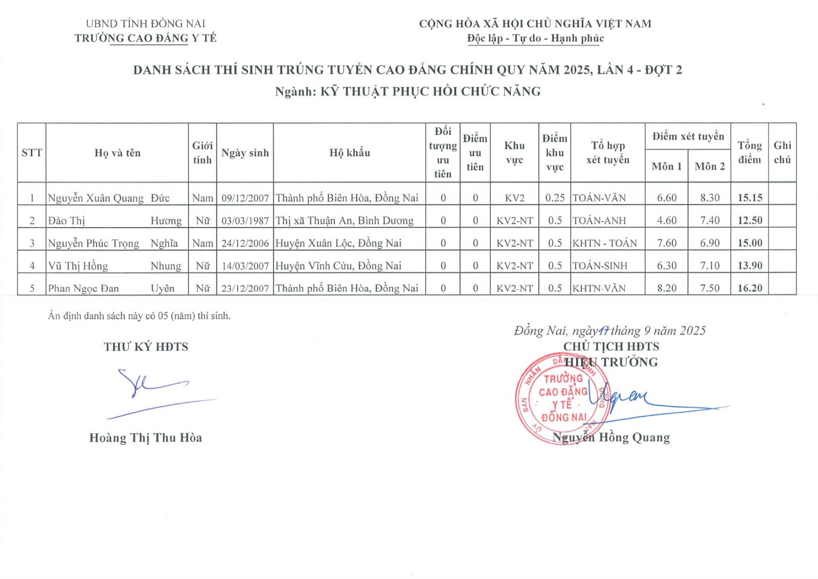Sau đây là danh sách thí sinh trúng tuyển Cao đẳng chính quy năm 2025, lần 4 đợt 2 các ngành: