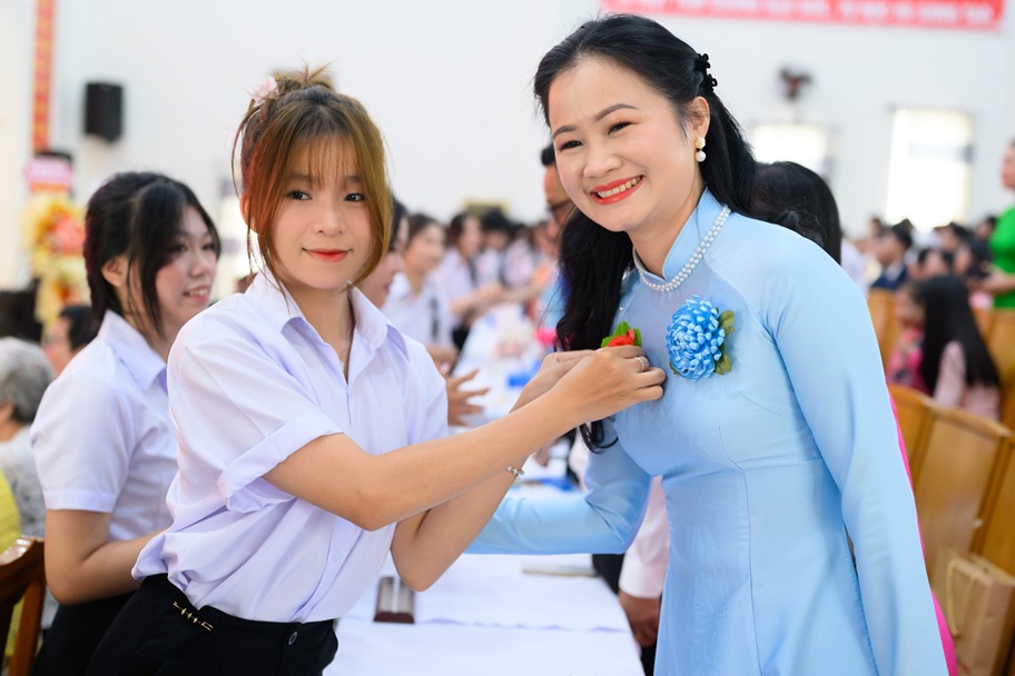 Hòa trong không khí trang trọng và ấm áp của Ngày Nhà giáo Việt Nam 20/11, hình ảnh các em sinh viên nâng niu những bông hoa đỏ thắm, trân trọng cài lên ngực áo thầy cô như một lời tri ân sâu sắc thật sự đã trở thành khoảnh khắc đẹp nhất của buổi lễ. Mỗi bông hoa là một lời cảm ơn chân thành, là sự gửi gắm bao tình cảm thương kính của những người học trò dành cho những người đã tận tâm dìu dắt, truyền tri thức và vun bồi nhân cách. Khoảnh khắc ấy không chỉ làm rạng rỡ nụ cười thầy cô mà còn lan tỏa ý nghĩa nhân văn, thể hiện đạo lý “tôn sư trọng đạo” được thế hệ sinh viên tiếp nối và gìn giữ.