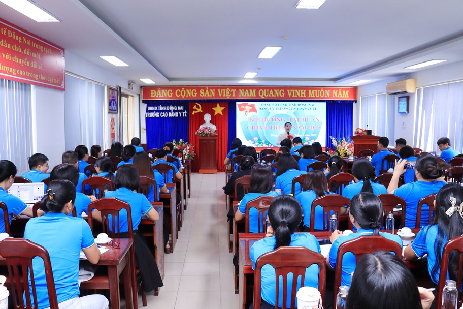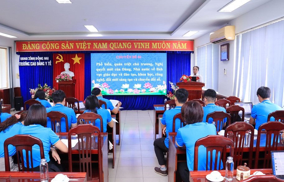 Nhằm bồi dưỡng, nâng cao nhận thức chính trị cho đội ngũ cán bộ giảng viên, viên chức cập nhật kiến thức mới từ các Nghị quyết, Chỉ thị của Đảng, những vấn đề thực tiễn mới ở trong nước và thế giới (theo Công văn số: 51–CV/BTGDVTU ngày 21/07/2025 của Ban Tuyên giáo và dân vận tỉnh Ủy Đồng Nai và Công văn số 1735/UBND– KGVX ngày 25 tháng 7 năm 2025 của Ủy ban Nhân dân tỉnh về việc triển khai chương trình bồi dưỡng, tập huấn chính trị hè trên địa bàn tỉnh năm 2025). Sáng ngày 28 tháng 08 năm 2025, Trường Cao đẳng Y tế Đồng Nai tổ chức “Học tập, bồi dưỡng chính trị hè năm 2025” cho toàn thể cán bộ giảng viên, viên chức Nhà trường.