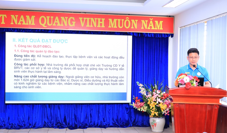 Tại hội nghị, ThS. Nguyễn Quốc Huy – Trưởng phòng Quản lý Đào tạo và Đảm bảo chất lượng đã trình bày báo cáo tổng kết năm học 2024 – 2025 và triển khai phương hướng, nhiệm vụ năm học 2025 – 2026. Báo cáo nhấn mạnh định hướng tập trung vào việc nâng cao chất lượng đào tạo, đẩy mạnh nghiên cứu khoa học, mở rộng hợp tác quốc tế, tăng cường chuyển đổi số và xây dựng đội ngũ cán bộ, giảng viên vững mạnh cả về chuyên môn lẫn phẩm chất chính trị.